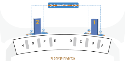 · T1(1터미널 / 아시아나항공, 제주항공, 티웨이항공) 스마트패스 서비스 사용가능 출국장 위치 안내 · T2 (2터미널 / 대한항공, 진에어, 델타항공) 스마트패스 서비스 사용가능 출국장 위치 안내