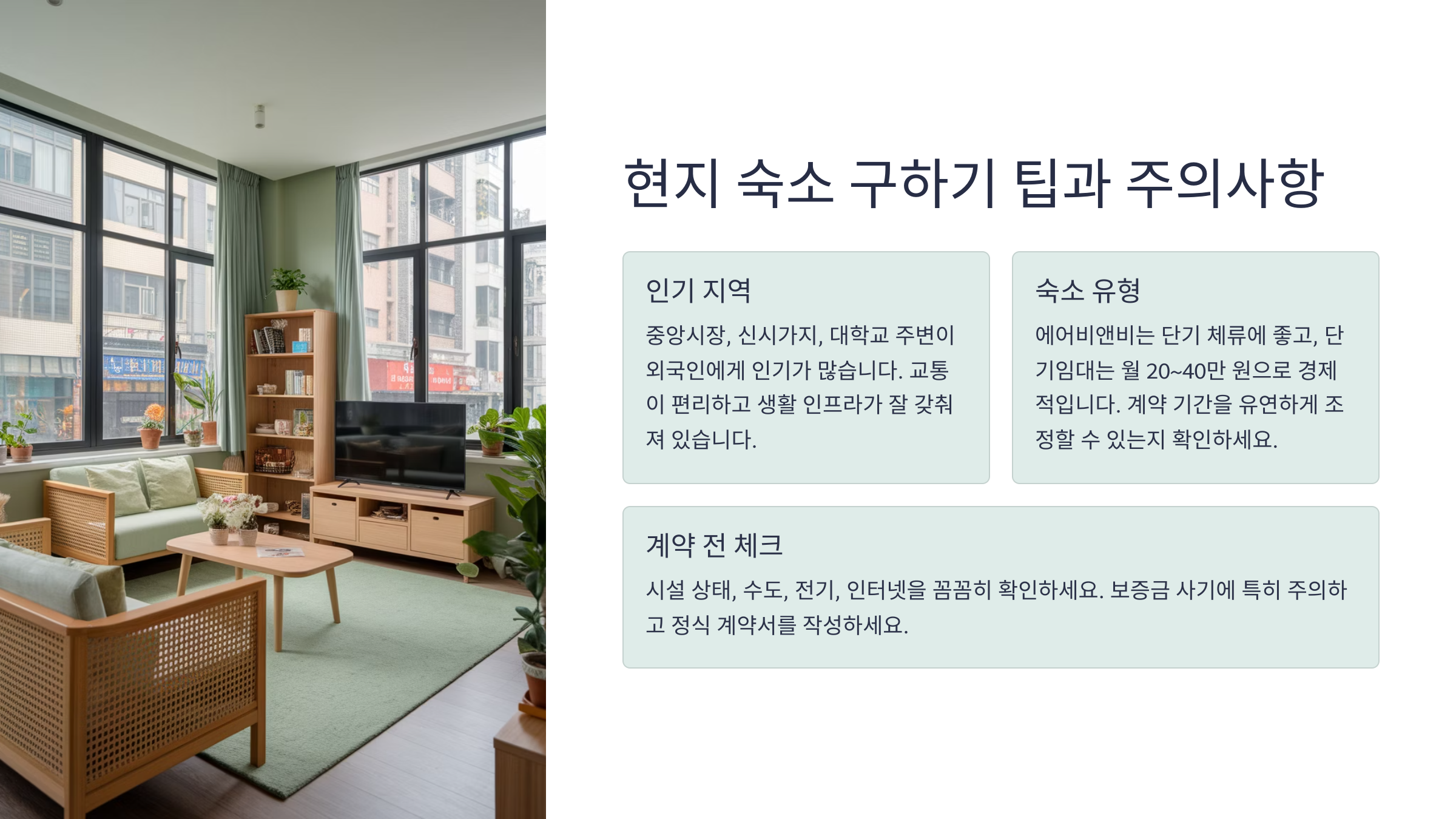부동산 소개 수수료는 보통 한 달 월세의 50% 정도이고, 위조 계약서를 주의해야 해요. 현지인 친구나 언어 교환 파트너에게 도움을 요청하면 훨씬 수월하게 계약할 수 있어요.