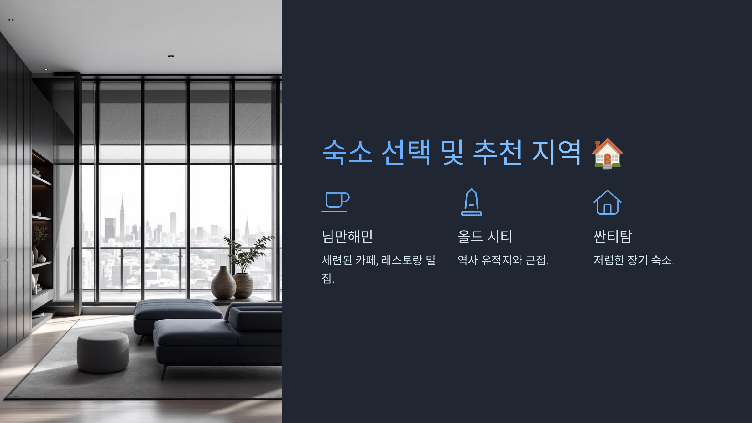 지역 특징 추천 유형 니만해민 트렌디한 카페와 쇼핑몰, 디지털 노마드 성지 장기 거주자, 프리랜서 올드시티 역사적인 사원, 저렴한 숙소 단기 여행자 산티탐 현지 시장, 저렴한 생활비 예산 절약형 여행자 숙소를 고를 때는 위치와 인터넷 속도를 꼭 확인하세요! 특히 원격 근무를 할 예정이라면 인터넷이 빠른 곳이 필수예요. 🚀
