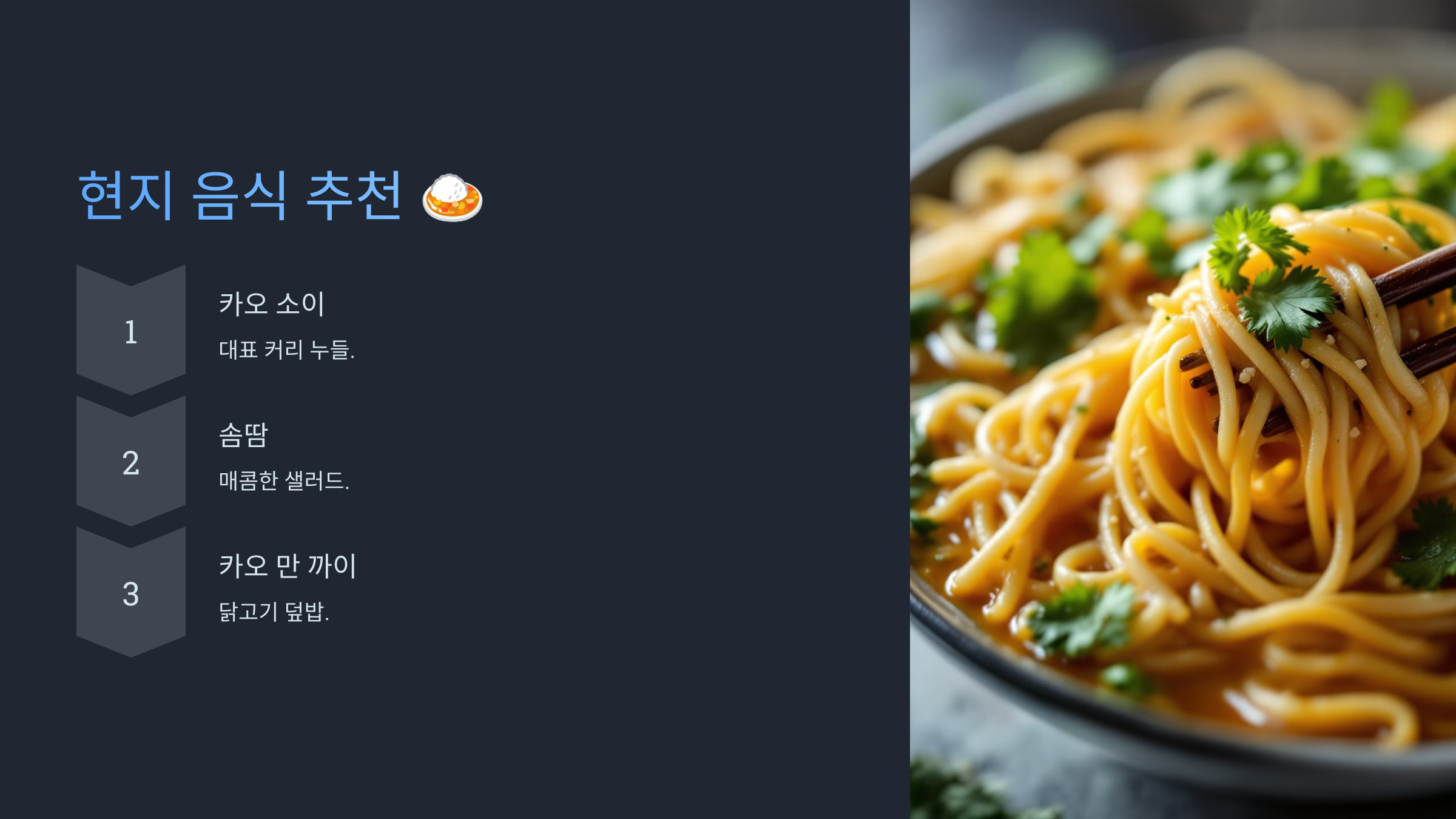 카오 소이(Khao Soi)는 치앙마이에서 꼭 먹어봐야 할 대표적인 요리예요. 코코넛 밀크가 들어간 커리 국물에 바삭한 튀긴 국수를 올려 먹는 요리로, 부드러우면서도 매콤한 맛이 일품이에요. 🍜
