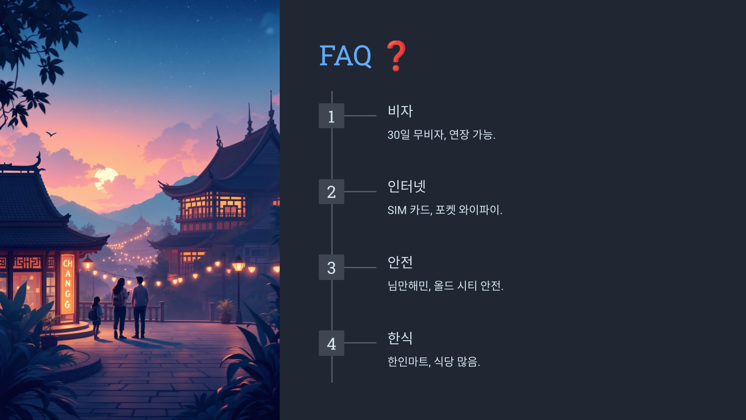 항목 예상 비용 숙소 (월 렌트 기준) 20만~50만 원 식비 10만~20만 원 교통비 5만~10만 원 액티비티 10만~30만 원 특히 로컬 식당과 노점에서 식사하면 하루 식비를 1~2만 원 수준으로도 해결할 수 있어요. 카페 문화가 발달한 만큼 커피값은 한국과 비슷하니 참고하세요! ☕
