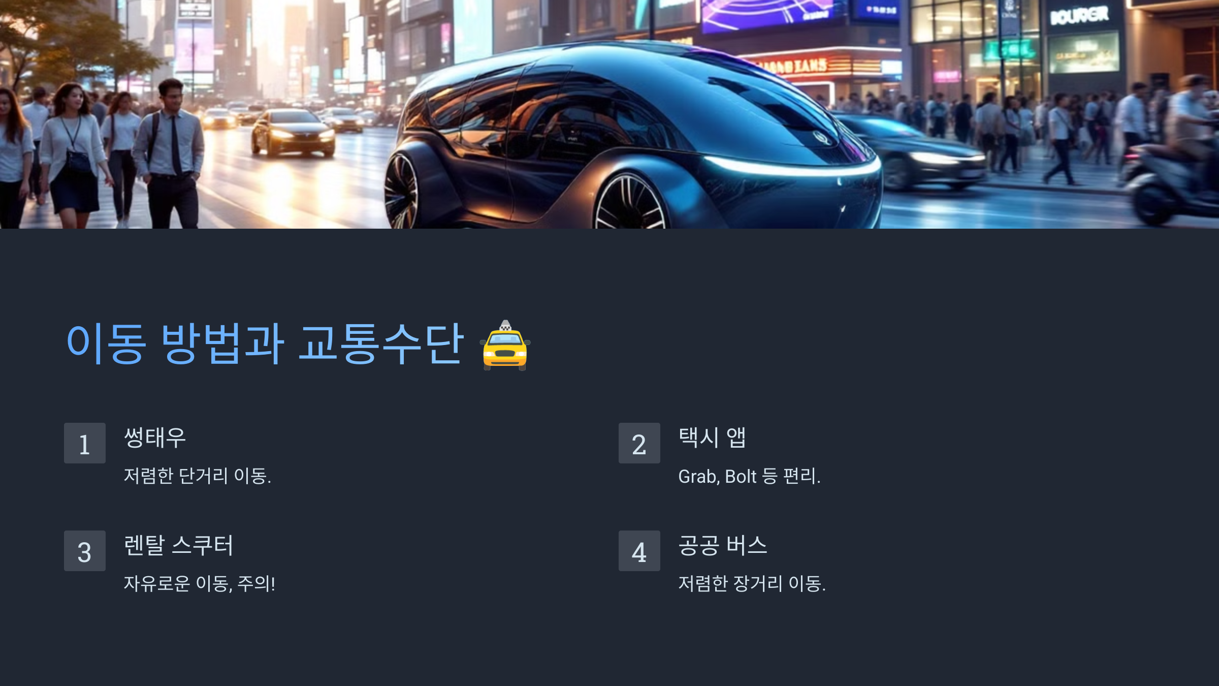 그랩(Grab)과 볼트(Bolt) 같은 차량 호출 앱도 많이 사용돼요. 요금은 일반 택시보다 저렴하고, 목적지를 직접 입력할 수 있어서 편리해요. 단, 러시아워에는 요금이 오를 수 있어요. 🚕📱