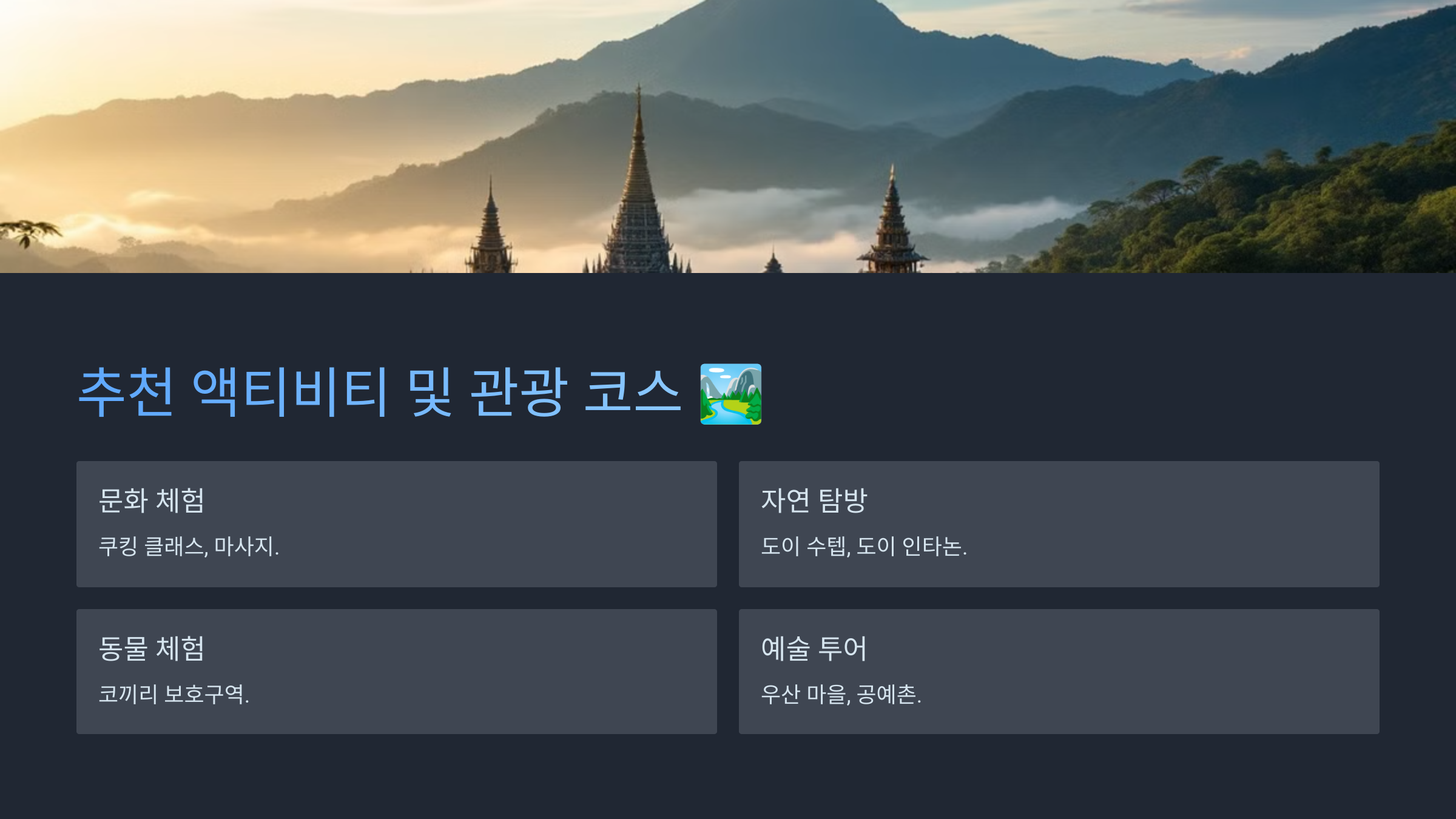 치앙마이는 자연과 문화가 조화를 이루는 곳이라 다양한 액티비티와 관광 명소가 있어요. 3주 동안 여유롭게 즐길 수 있는 추천 코스를 소개할게요! 🌿