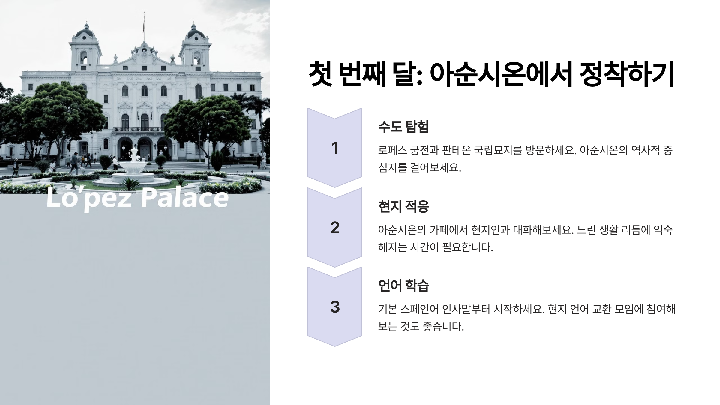 🌍 파라과이는 아름다운 자연경관과 역사적인 유적지가 많아요. 두 번째 달에는 수도를 벗어나 파라과이의 전통적인 지역과 자연 속에서 힐링할 수 있는 시간을 가져보는 것이 좋아요.📌 2개월 차 목표: