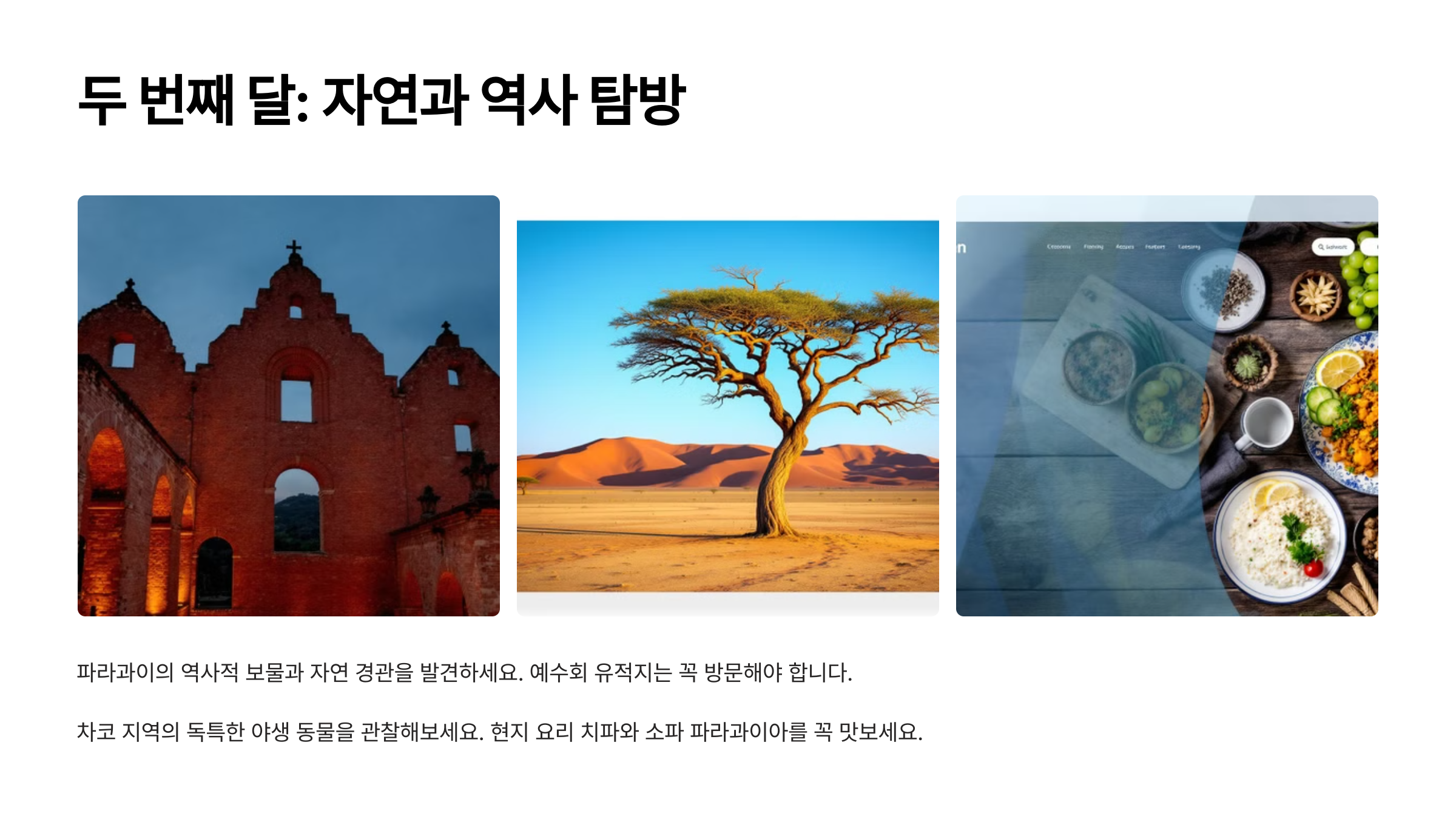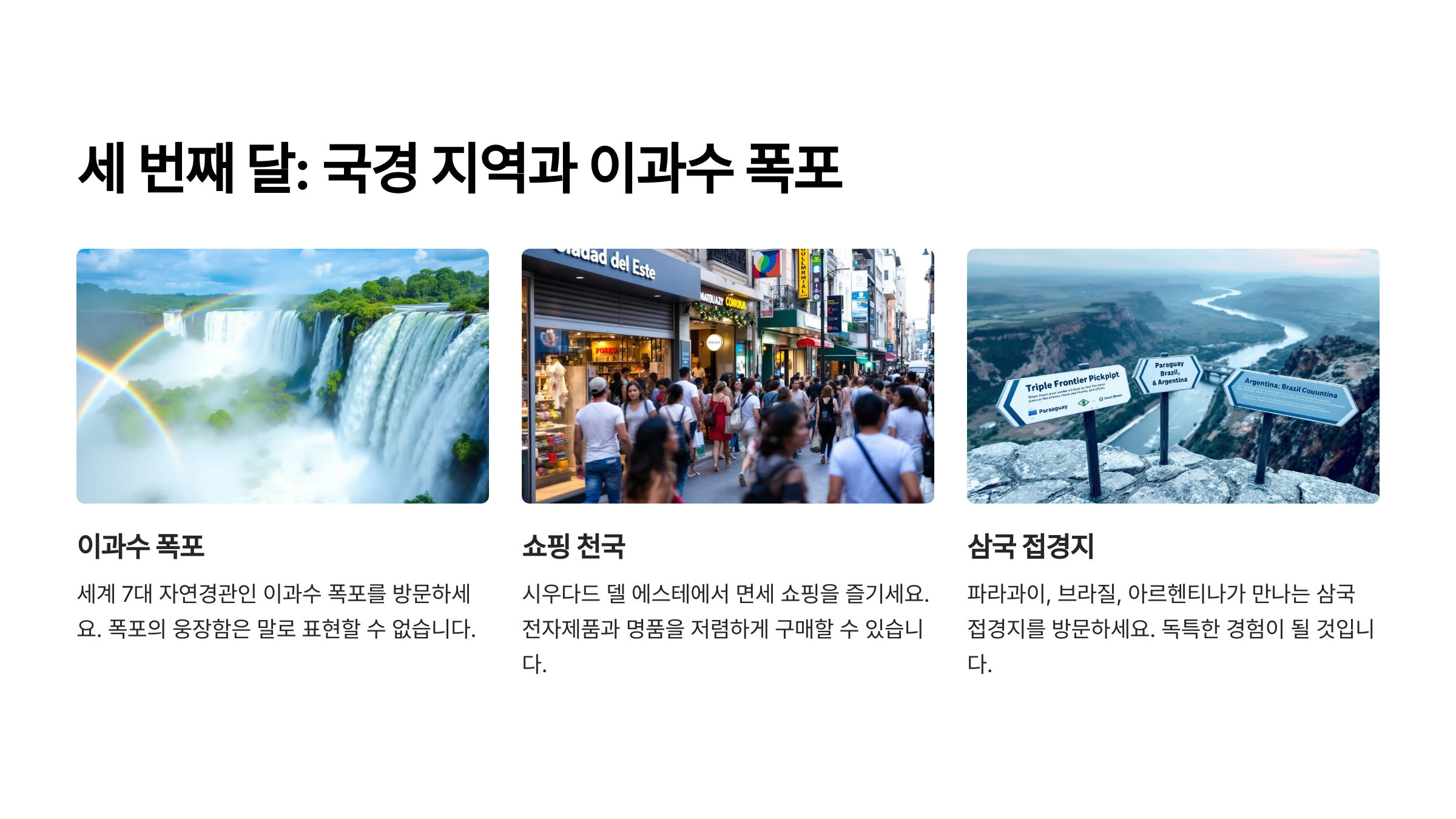 📌 두 번째 달 동안 파라과이의 자연을 만끽하고, 역사적인 유적지를 방문하며 이 나라의 깊은 문화를 경험할 수 있어요. 이제 세 번째 달에는 파라과이의 국경 지역과 이과수 폭포로 떠나볼 차례예요! 🚀