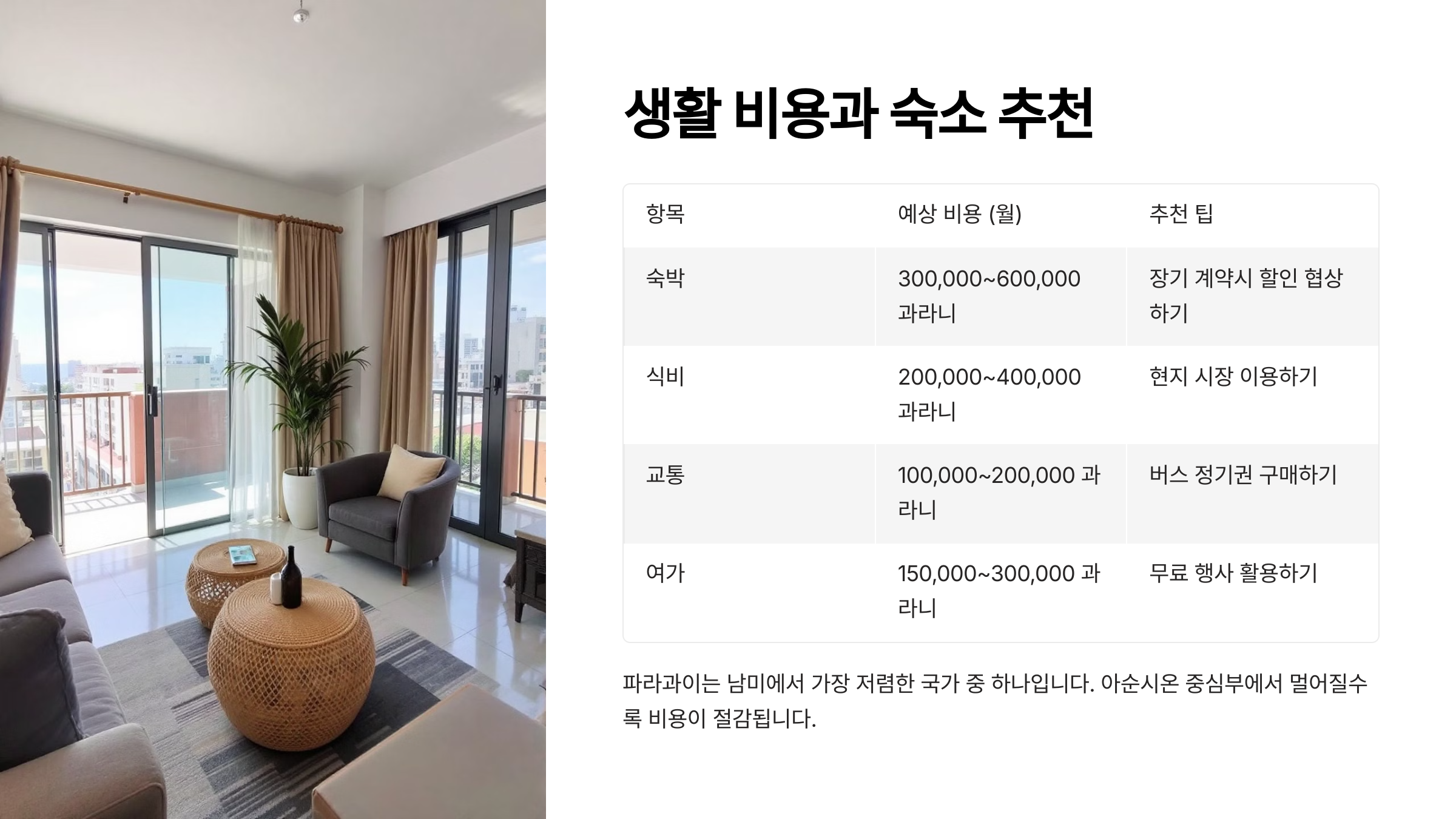 📌 마지막 한 달 동안 파라과이의 국경을 넘나들며 남미의 다채로운 문화를 경험해 보세요! 이제 파라과이에서의 생활 비용과 숙소 추천 정보를 알아볼 차례예요. 🏡