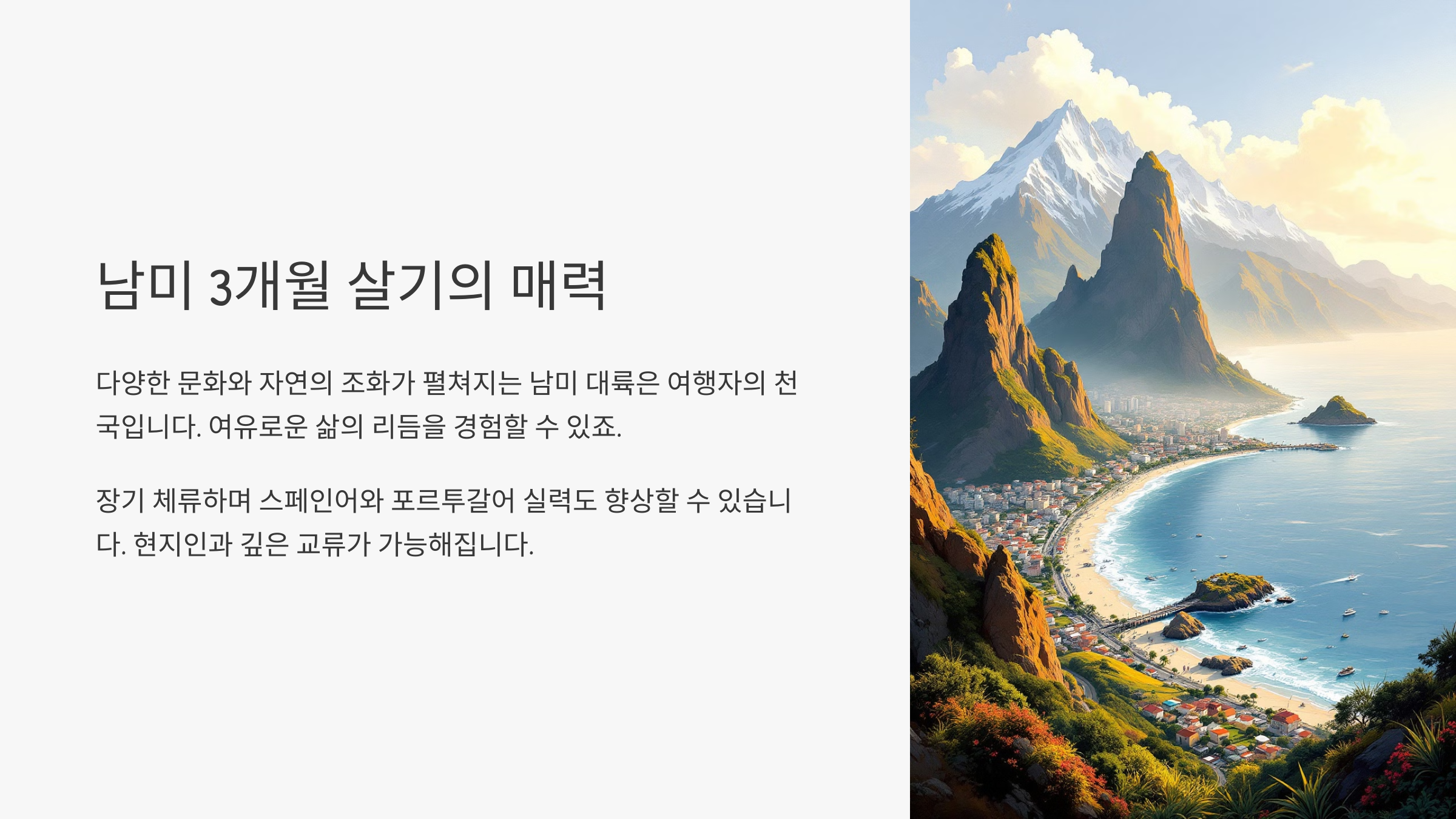 남미에서 3개월을 살면서 현지의 문화, 자연, 음식을 제대로 즐겨보세요! 🌍✈️