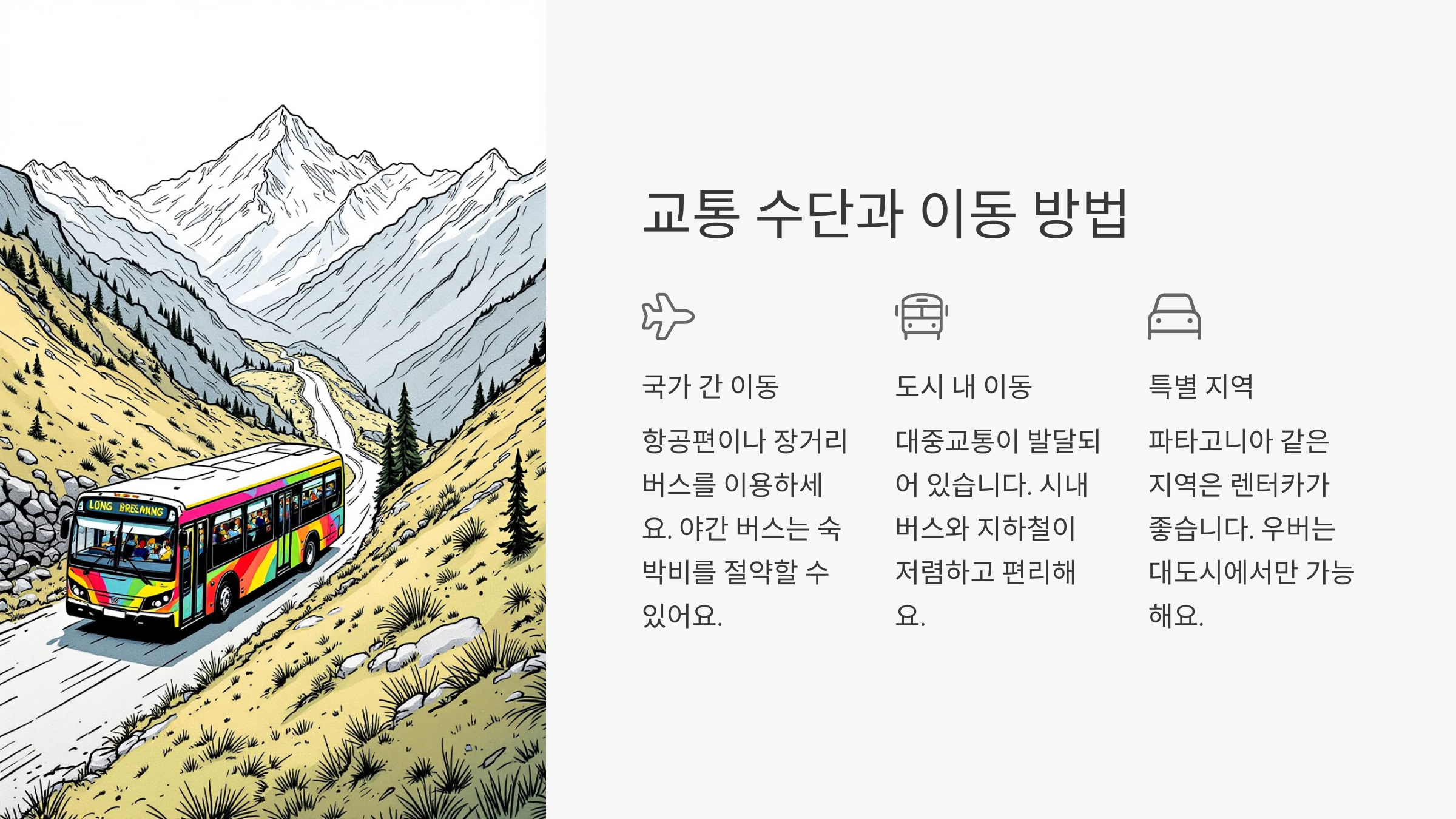 남미에서는 대중교통과 장거리 이동 방법을 잘 파악해야 해요. 국토가 넓기 때문에 버스와 항공편을 적절히 활용하는 것이 중요해요.