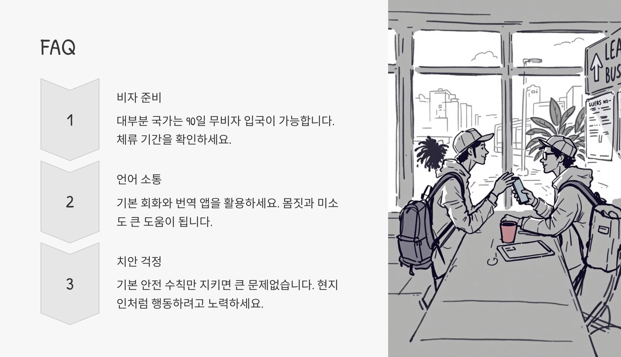 ✔ 안전: 야간 이동, 소지품 관리, 현금 보관에 주의하세요.