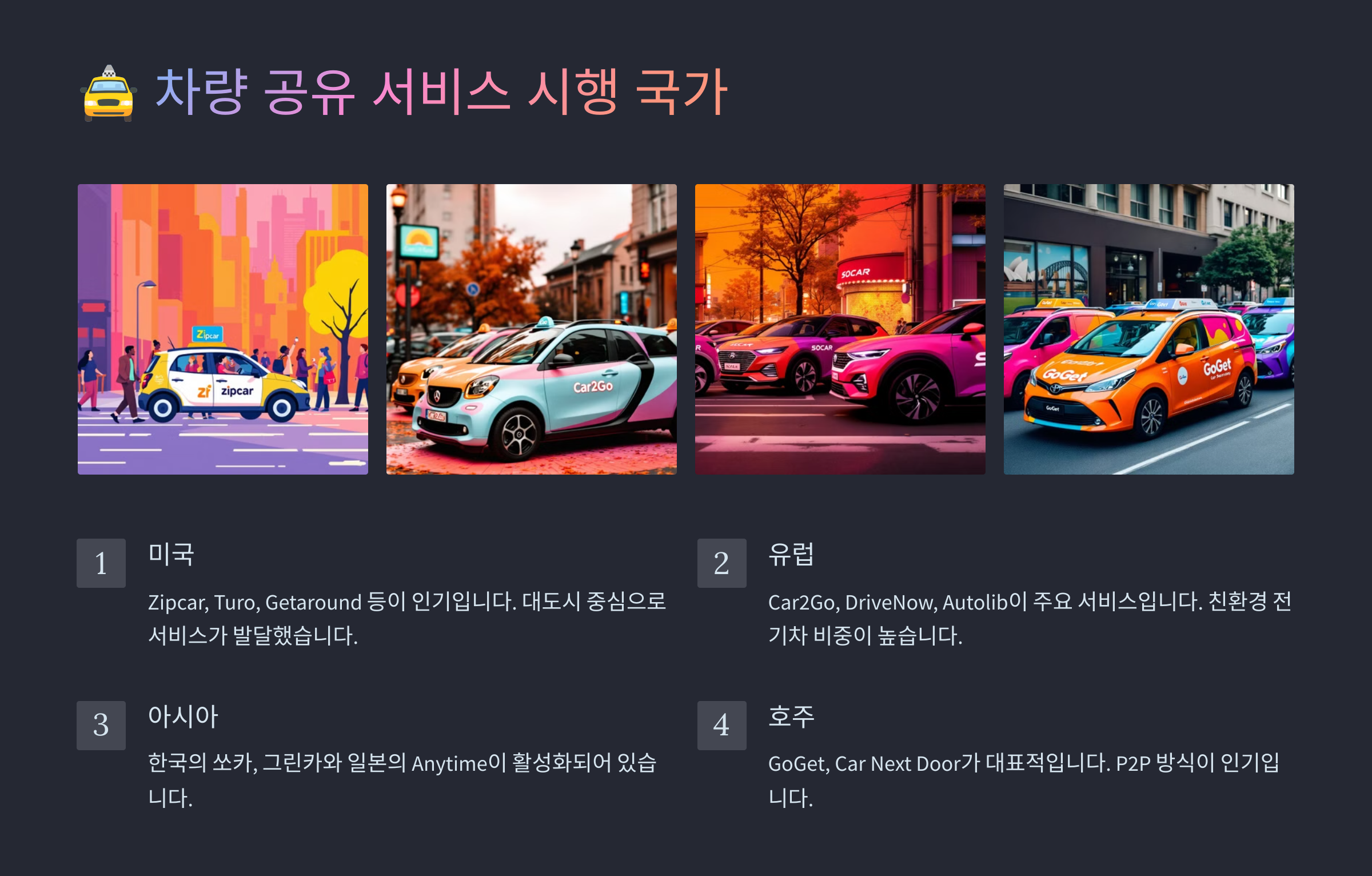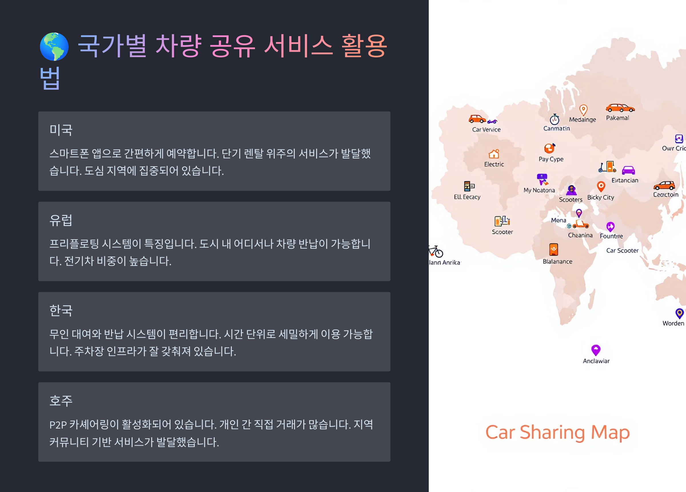 다음은 차량 공유 서비스가 활발하게 운영되는 주요 국가들이에요. 🚖