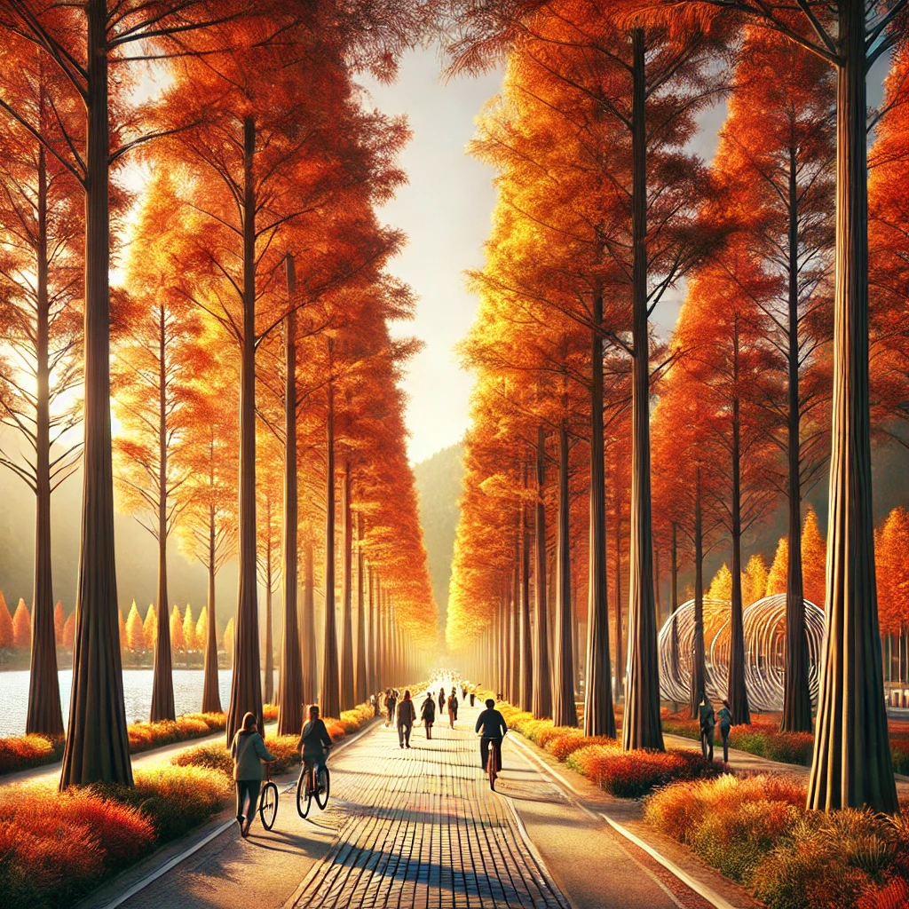 메타세쿼이아 길을 따라 걷다 보면, 황금빛과 붉은빛으로 물든 나무들이 쭉 뻗어 있어 마치 동화 속에 들어온 듯한 느낌을 줍니다. 또한, 남이섬은 문화 예술 작품이 곳곳에 배치되어 있어 자연 속에서 예술과 함께 힐링할 수 있는 장소이기도 합니다.