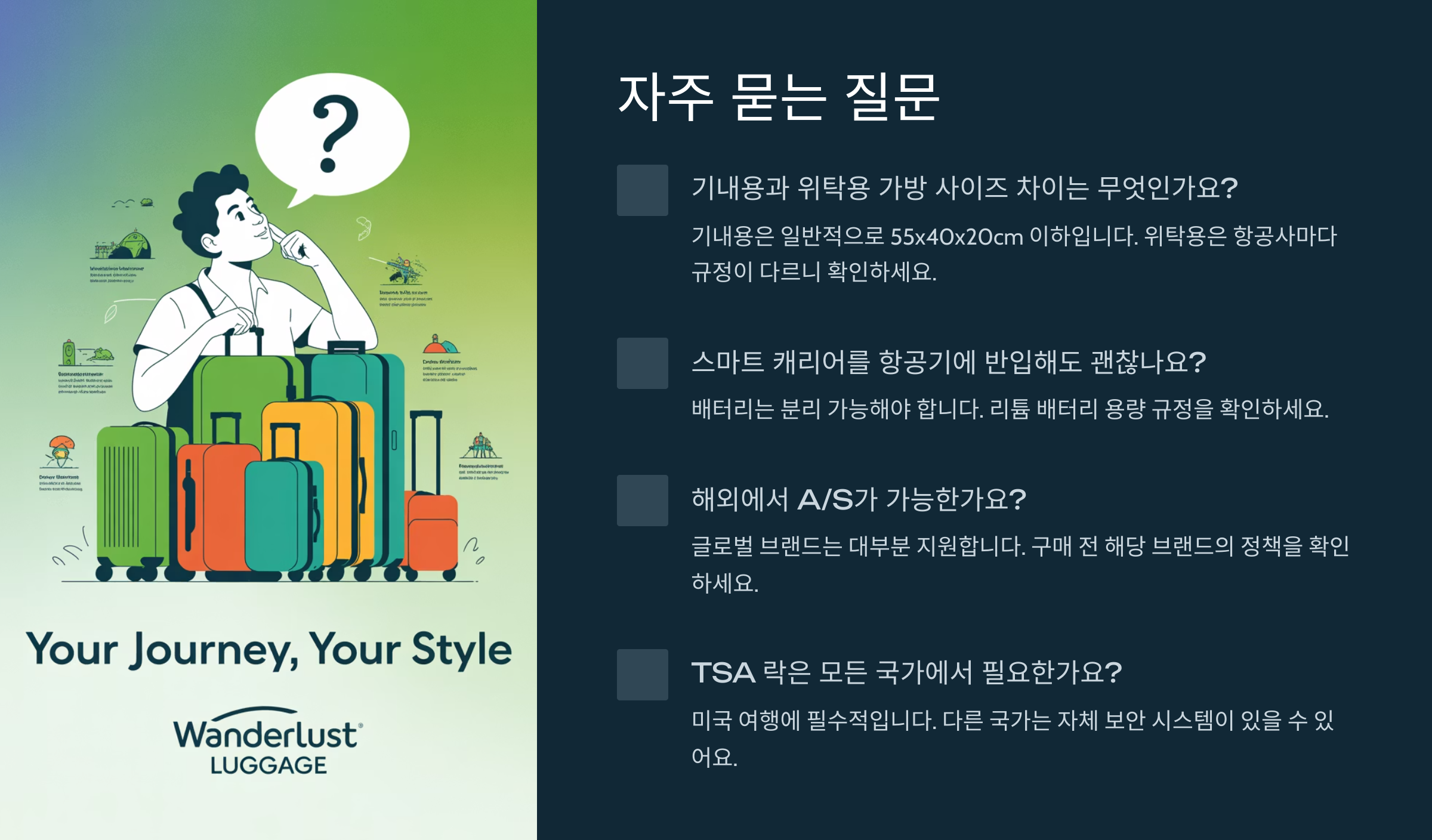 Q1. 기내용 캐리어 사이즈는 몇 인치가 적당할까요?A1. 대부분 항공사 기준으로는 20인치 이하, 가로 55cm x 세로 40cm x 높이 23cm 정도가 적당해요. 무게는 보통 7~10kg 제한이 있어요.